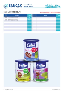 Sancak Puanlı Seyahat Sistemi CARE AND MORE (CELIA) GEÇERLİLİK TARİHİ: 14 MART / 14 MAYIS 2022 18694 CELIA BEBEK DEVAM SUTU 1 6,94 18695 CELIA BEBEK DEVAM SUTU 2 6,94 18696 CELIA BEBEK DEVAM SUTU 3 6,94 44 SANCAK ECZA DEPOSU www.sancakecza.com.tr